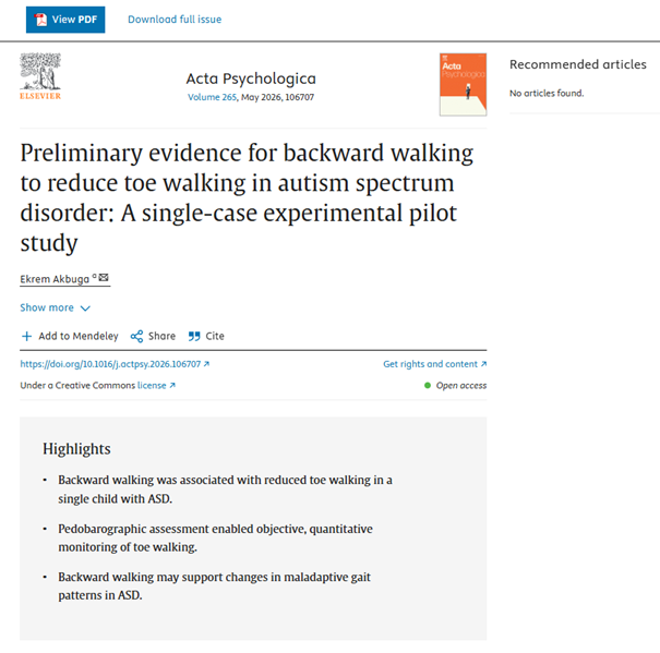 Bölümümüz öğretim üyelerinden Doç. Dr. Ekrem AKBUĞA’ nın "Preliminary Evidence for Backward Walking to Reduce Toe Walking in Autism Spectrum Disorder: A Single-Case Experimental Pilot Study" başlıklı çalışması, Web of Science SSCI indeksli ve Q2 kategorisindeki Acta Psychologica dergisinde yayımlanmıştır.